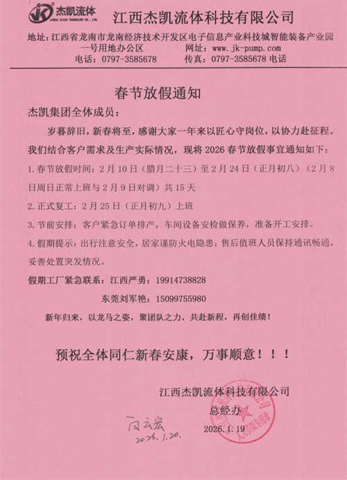 杰凯流体|2026年春节放假通知!