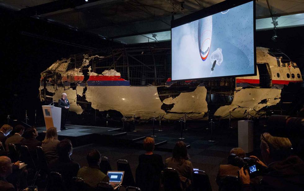发布会现场,荷兰调查人员展示了MH17航班前半截残骸的重组。当扭曲且布满弹孔的客机残骸出现在眼前时,现场媒体记者一片沉寂。